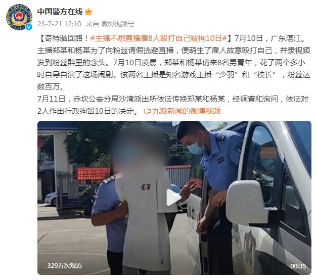 7月10日,广东湛江。主播郑某和杨某为了向粉丝请假逃避直播,便萌生了雇人故意殴打自己,并录视频发到粉丝群里的念头。7月10日凌晨,郑某和杨某请来8名男青年,花了两个多小时自导自演了这场闹剧。该两名主播是知名游戏主播“少羽”和“校长”,粉丝达数百万。