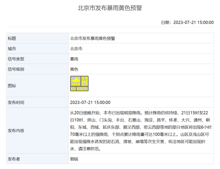北京市气象台7月21日15时升级发布暴雨黄色预警信号 :从20日傍晚开始,本市已出现明显降雨。预计降雨仍将持续,21日15时至22日10时,房山、门头沟、丰台、石景山、海淀、昌平、怀柔、大兴、通州、朝阳、东城、西城、延庆东部、顺义西部、密云西部等地的部分地区将出现6小时70毫米以上的强降雨,个别点累计降雨量可达100毫米以上 。山区及浅山区可能出现强降水诱发的泥石流、滑坡、崩塌等次生灾害,低洼地区可能出现积水,请注意防范。
