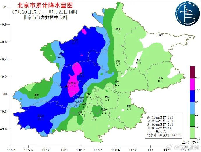 7月20日17时至21日14时,全市平均降水量24.2毫米,城区平均16.0毫米,全市和城区最大为海淀凤凰岭的167.6毫米,最大小时降水强度为海淀苏家坨的45.5毫米/小时(21日12时-13时)。