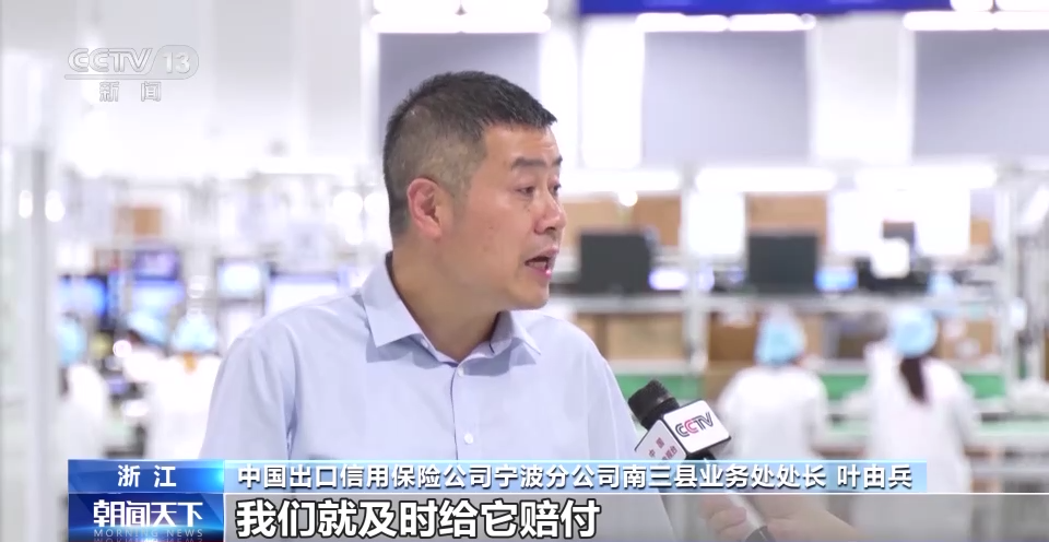 中国出口信用保险公司宁波分公司党委书记总经理 陈志军:今年上半年,我们一共支持140多家当地企业拓展国内市场,国内贸易信用保险总承保金额达到了74亿元人民币,帮助企业有效防范信用风险,支持企业内外贸一体化发展。