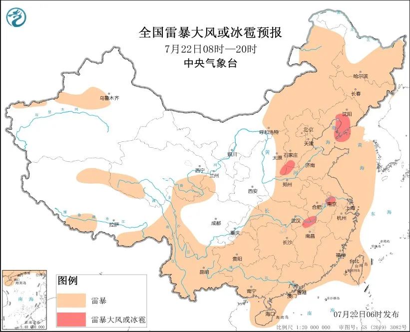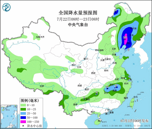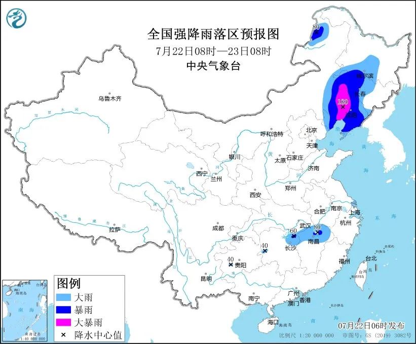 预计今天(7月22日)白天到夜间,内蒙古东部、辽宁、吉林中西部、黑龙江南部、江西北部、湖南东北部等地部分地区有大到暴雨,内蒙古东南部、吉林西部、辽宁中西部等地部分地区有大暴雨(100至150毫米) 。