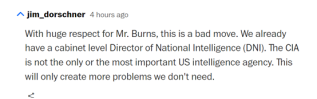 还有人称,“非常尊重伯恩斯先生,但这是一个错误的提拔。我们已有国家情报总监作为内阁成员,中央情报局不是美国唯一或最重要的情报机构。这只会制造更多我们不需要的问题。”