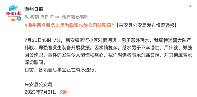 7月21日晚,安徽省滁州市来安县公安局通报:7月20日15时17分 ,新安镇滨河小区对面河道一男子意外落水,该局特巡警大队严伟骏、郑强 着救生装备开展救援。