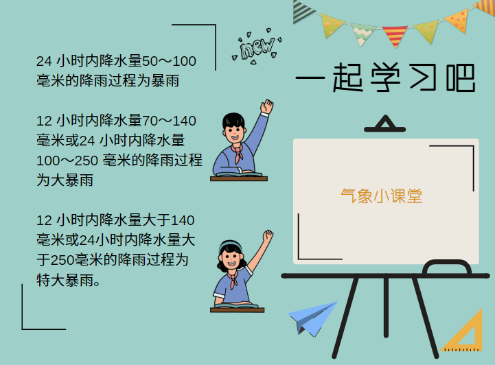 气象上对暴雨有明确的区分,在我国,将24小时降水量为50毫米或以上的雨称为“暴雨”。按其降水强度大小,又再分为三个等级,即24小时降水量超过50毫米称“暴雨”,超过100毫米称“大暴雨”,超过250毫米称“特大暴雨”。