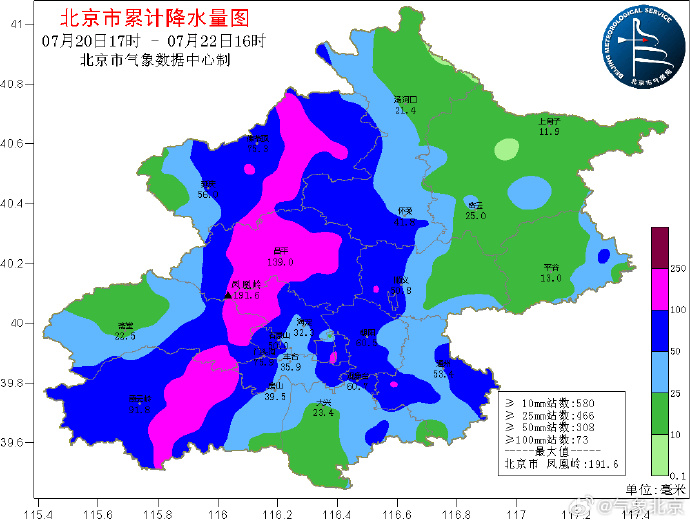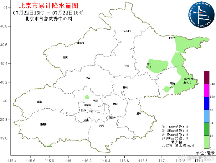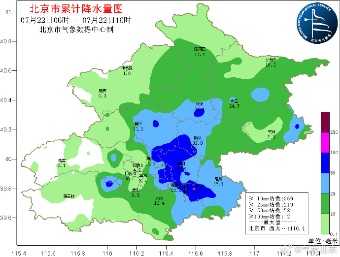 7月22日06时至16时,北京全市平均降雨量22.8毫米,最大降雨量在通州西太平庄110.4毫米,最大雨强东城故宫50.4毫米。城六区平均降雨量39.5毫米,最大降雨量西城先农坛103.6毫米,最大雨强东城故宫50.4毫米。通州平均降雨量37.0毫米,最大降雨量通州西太平庄110.4毫米,最大雨强也在该站,40.8毫米。