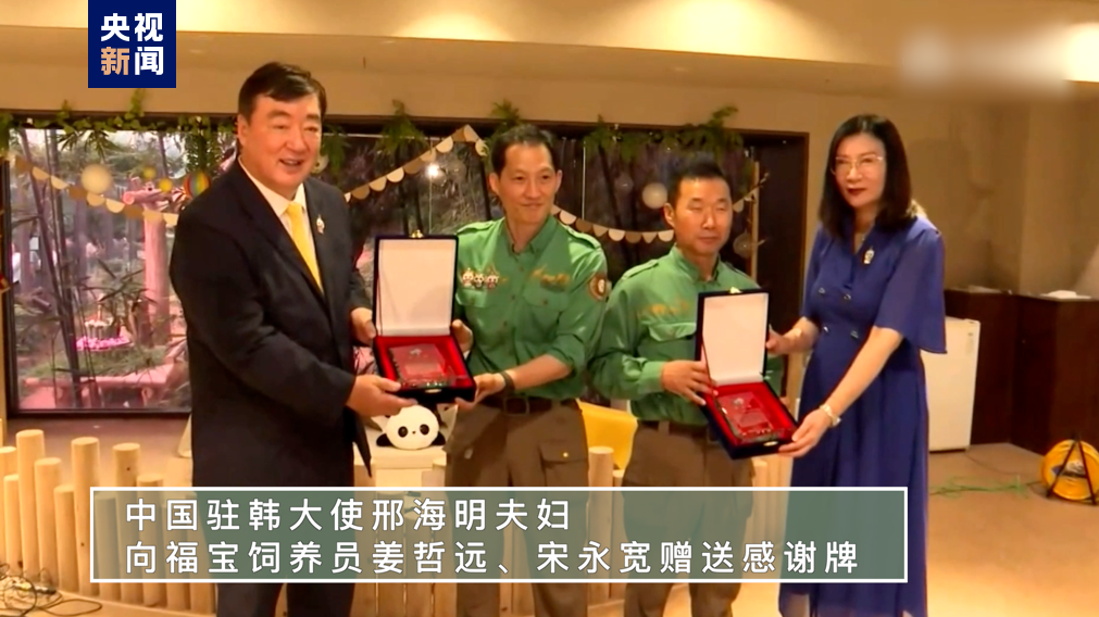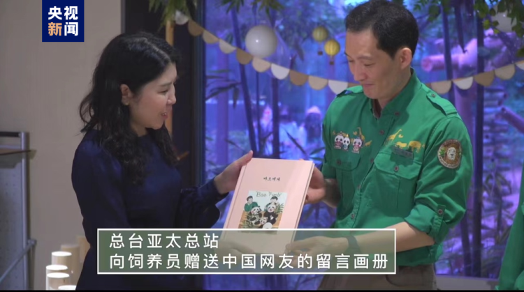 中国驻韩国大使邢海明在福宝三岁生日当天,特地向两位饲养员赠送感谢牌,总台亚太总站也将中国网友们给饲养员的留言、图片等翻译成韩语并结集成册,赠送给两位饲养员。