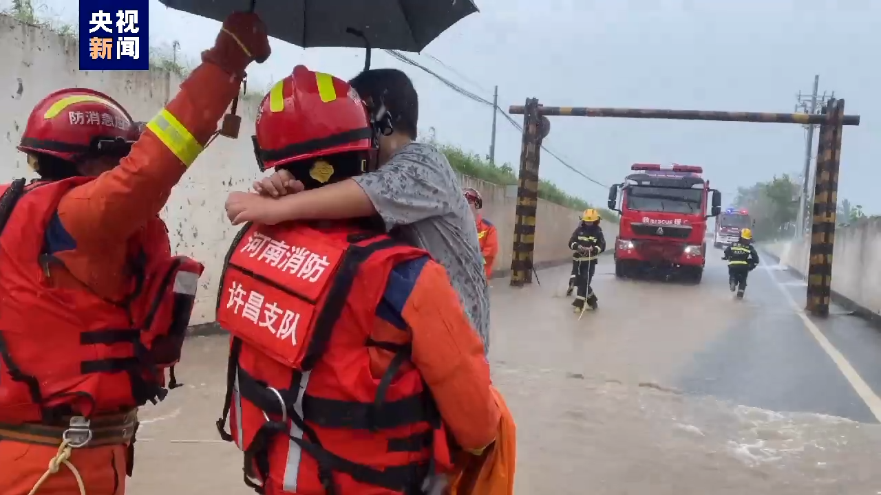 7月21日下午,河南省长葛市突降暴雨,佛耳湖镇一涵洞内积水严重,有轿车在涉水时熄火被困,车上载有一名刚做完手术的儿童。长葛市消防救援大队接到报警后,立即赶赴现场进行处置。