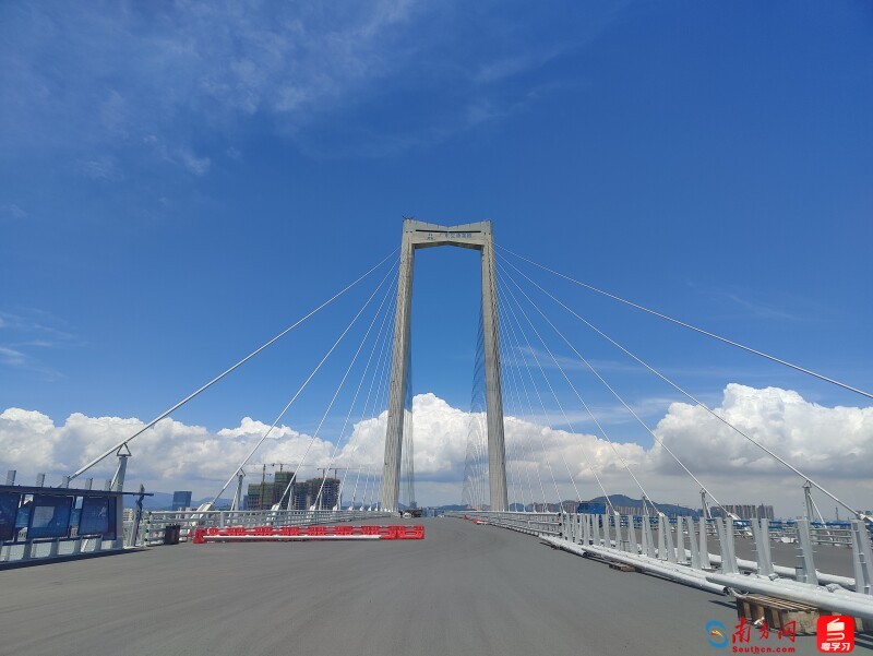 当天上午,采风团一行到达深中通道中山大桥,桥面宽阔平坦,主塔高耸,雄伟壮观,大桥桥面铺装已完成,两侧护栏则还没装好。