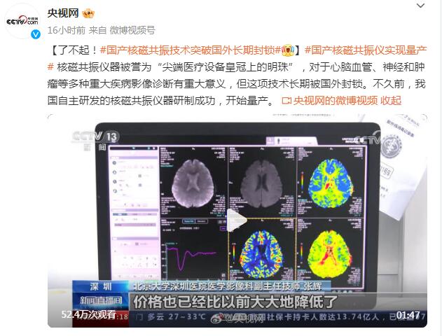 核磁共振仪器被誉为“尖端医疗设备皇冠上的明珠”,对于心脑血管、神经和肿瘤等多种重大疾病影像诊断有重大意义,但这项技术长期被国外封锁。不久前,我国自主研发的核磁共振仪器研制成功,开始量产。