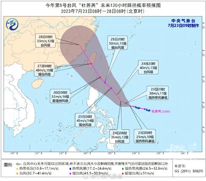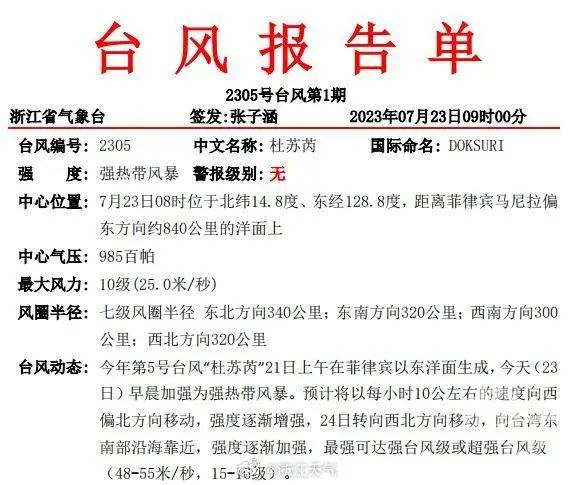 “杜苏芮”今天早晨已经加强为强热带风暴级 ,11点的中心位于菲律宾马尼拉偏东方向约810公里的西北太平洋洋面上,就是北纬14.8度、东经128.5度,中心附近最大风力有10级(28米/秒),中心最低气压为982百帕,七级风圈半径300-340公里。预计,“杜苏芮”将以每小时10-15公里左右的速度向西偏北方向移动,强度逐渐加强。