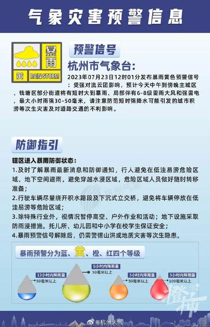 杭州市气象台2023年07月23日12时01分发布暴雨黄色预警信号 :受强对流云团影响,预计今天中午到傍晚主城区、钱塘区部分街道将有短时大到暴雨、局部伴有6-8级雷雨大风和强雷电,最大小时雨强30-50毫米,请注意防范短时强降水可能引发的城市积涝等次生灾害及对道路交通的不利影响。
