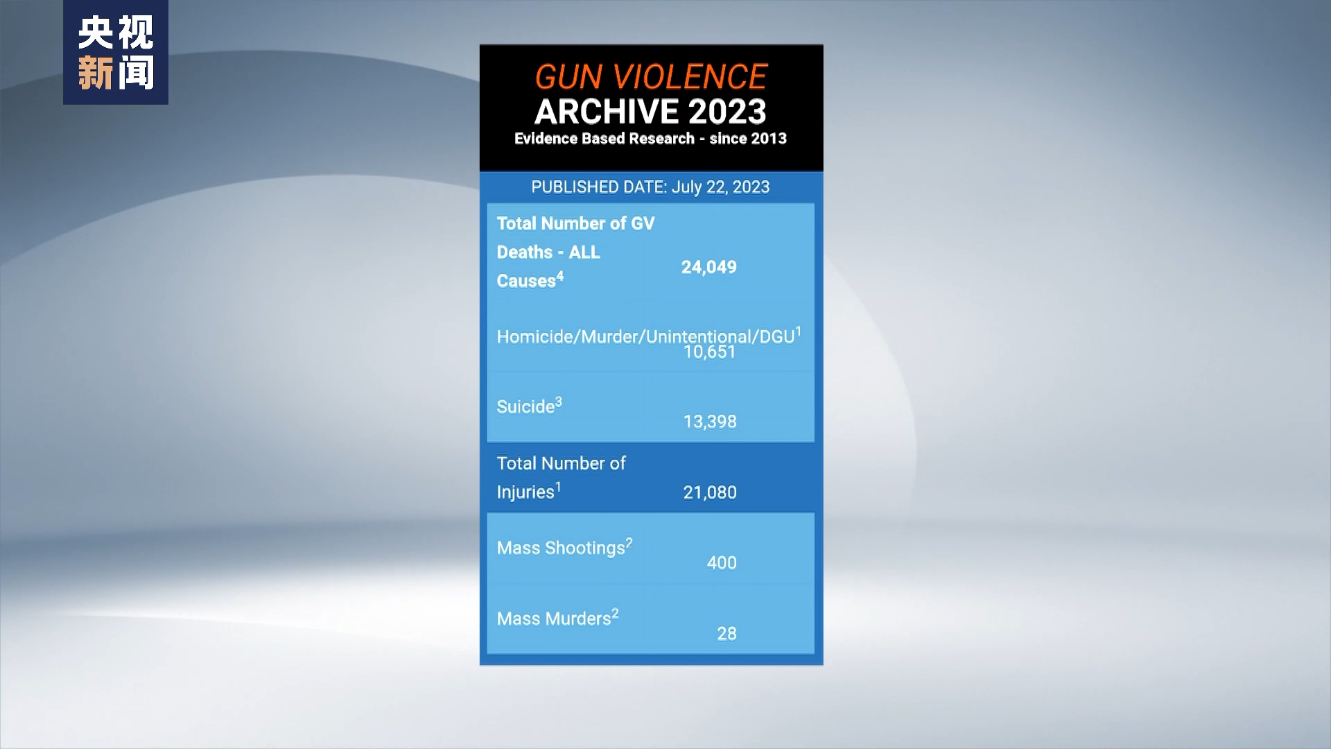 据美国枪支暴力档案网站数据,今年以来,截至7月22日,全美各类涉枪事件已造成超过2.4万人死亡,2.1万多人受伤,除枪手外造成至少4人伤亡的大规模枪击事件已达到400起。