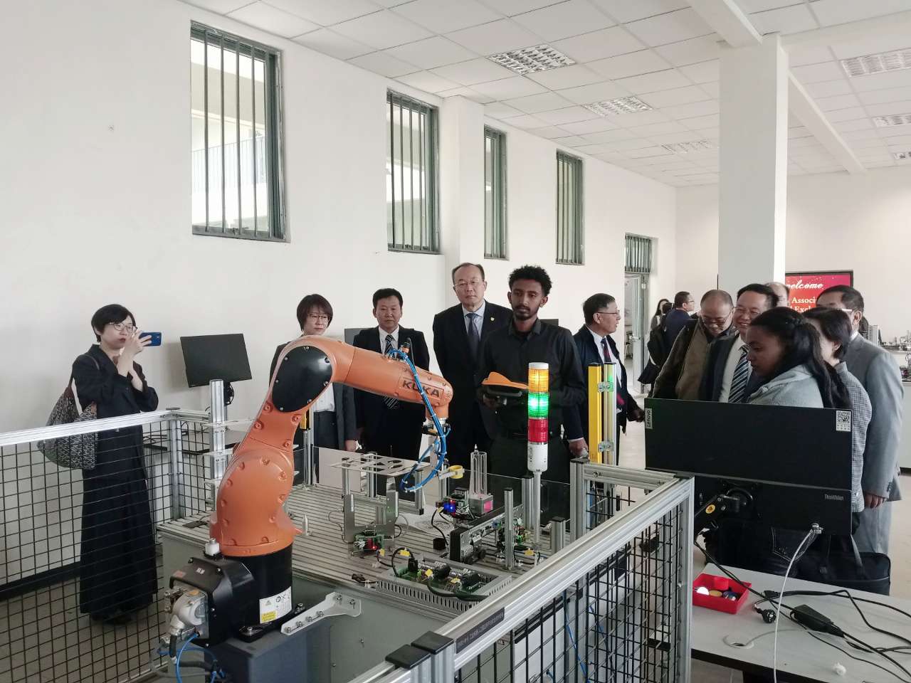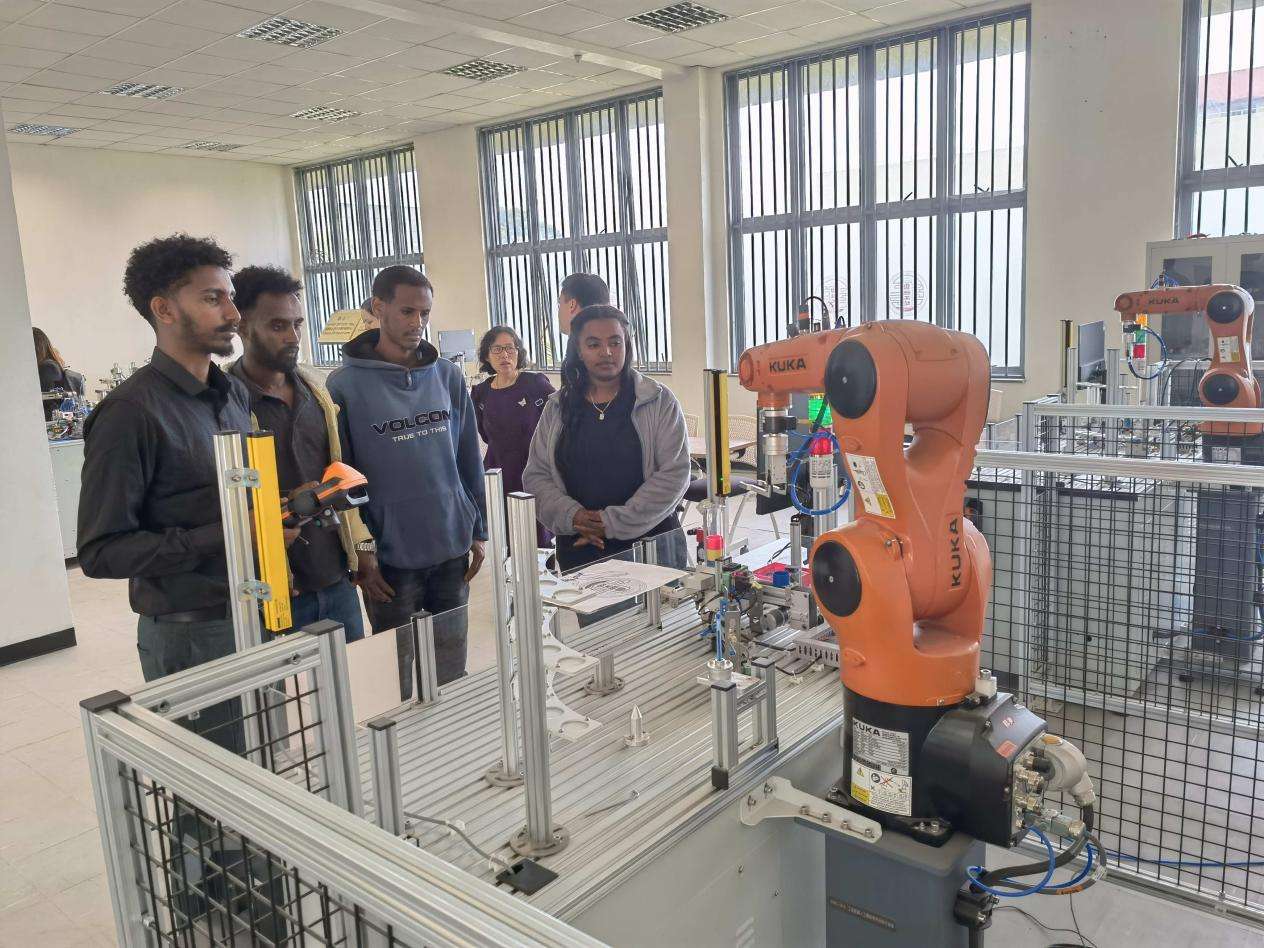 埃塞联邦职业技术培训学院副校长哈夫托姆·格布雷齐亚卜赫对记者表示,众所周知,包括人工智能在内的前沿科技驱动着现代工业化进程的迅猛发展,埃塞工业化发展需要高技术人才以适应现代工业的发展迭代。鲁班工坊聚焦工业传感器、机电一体化、工业控制、工业机器人4个技术方向,成为帮助包括教师和企业人员在内的技术专才提升能力建设的重要基地。该工坊不仅硬件设施配备水平较高,而且教学模式特点突出,强调真实环境下的工程实践教学。因此,鲁班工坊不仅服务于埃塞,也服务于整个东非。“值得一提的是,我们与天津职业技术师范大学的合作模式非常好,短期培训和长期能力建设相结合,有效地完成技术和知识从中方向我方输出。目前我们学院至少有10余名教师前往中方合作学院完成进修培训课程。”