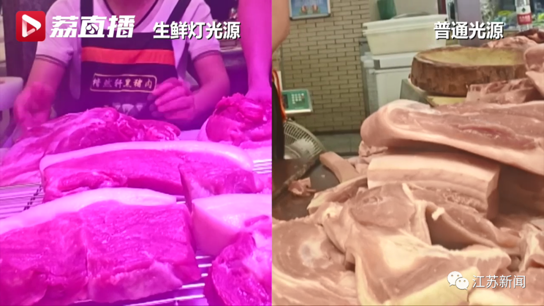 记者走访南京多家菜市场和超市注意到,生鲜肉类摊位和柜台普遍使用这类照明设施,也就是俗称的“生鲜灯”。肉类在“生鲜灯”粉红色灯光照射下,会显得更加鲜嫩且色泽饱满,而自然光或者普通灯照射下的生鲜肉,色泽就黯淡了许多。