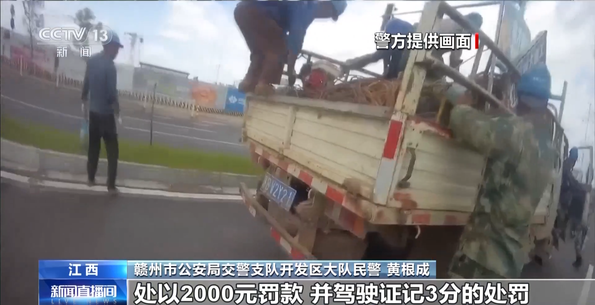 江西赣州市公安局交警支队开发区大队民警 黄根成:对货车驾驶人违反规定载客,超过十人的违法行为处以2000元罚款,驾驶证记3分的处罚。同时,我们对现场的施工人员进行了交通安全教育,强调他们这样乘车的危害性,并对工地负责人下达了隐患整改通知书,并进行警示约谈。