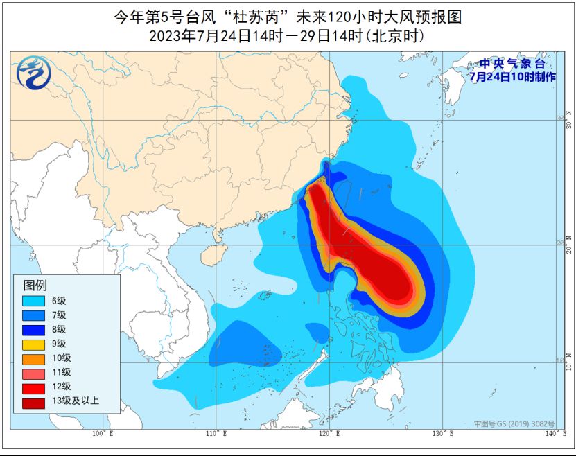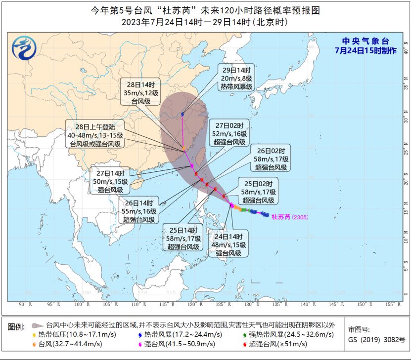 大风预报: 预计24日至29日,台湾以东洋面、巴士海峡、台湾海峡、南海大部、东海大部及钓鱼岛附近海域、长江口区、杭州湾、江苏南部沿海、上海沿海、浙江沿海、福建沿海、台湾岛及其沿海、广东东部沿海等地将先后出现6~8级大风,其中,巴士海峡、台湾东南部海面、台湾海峡、台湾岛南部沿海、福建中南部沿海将有9~11级大风、阵风12~14级,“杜苏芮”中心经过的附近海面或地区的风力有12~16级,阵风可达17级及以上。