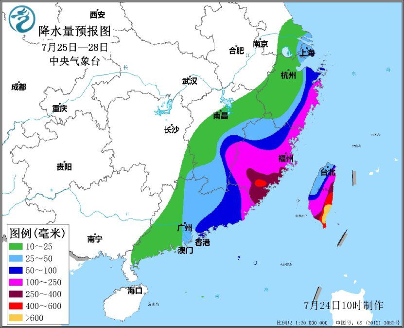 降雨预报: 预计25日至28日,台湾岛、浙江东部、福建、广东东部、江西东部和南部等地将先后出现大到暴雨,台湾岛东部和南部、福建中南部、浙江东部沿海等地部分地区有大暴雨,局地特大暴雨。上述地区累计降雨量有40~100毫米,台湾岛东部和南部、福建东部和中南部、浙江东部沿海、广东东北部等地部分地区有120~250毫米,局地300~500毫米,台湾岛东部局地可达600~800毫米;上述地区最大小时降水量30~60毫米,局地可达80毫米以上。降雨最强时段为27日夜间至28日。 其中,25日强降雨主要出现在台湾岛东部,26日至27日出现在台湾岛东部和南部、浙江东部沿海、福建东部,28日出现在广东东部沿海、福建、浙江东部沿海、江西东部和南部。