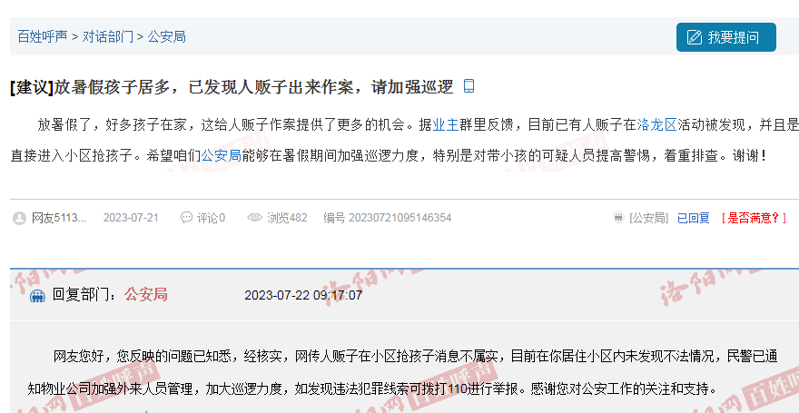 放暑假了,好多孩子在家,这给人贩子作案提供了更多的机会。据业主群里反馈,目前已有人贩子在洛龙区活动被发现,并且是直接进入小区抢孩子。希望咱们公安局能够在暑假期间加强巡逻力度,特别是对带小孩的可疑人员提高警惕,着重排查。谢谢!