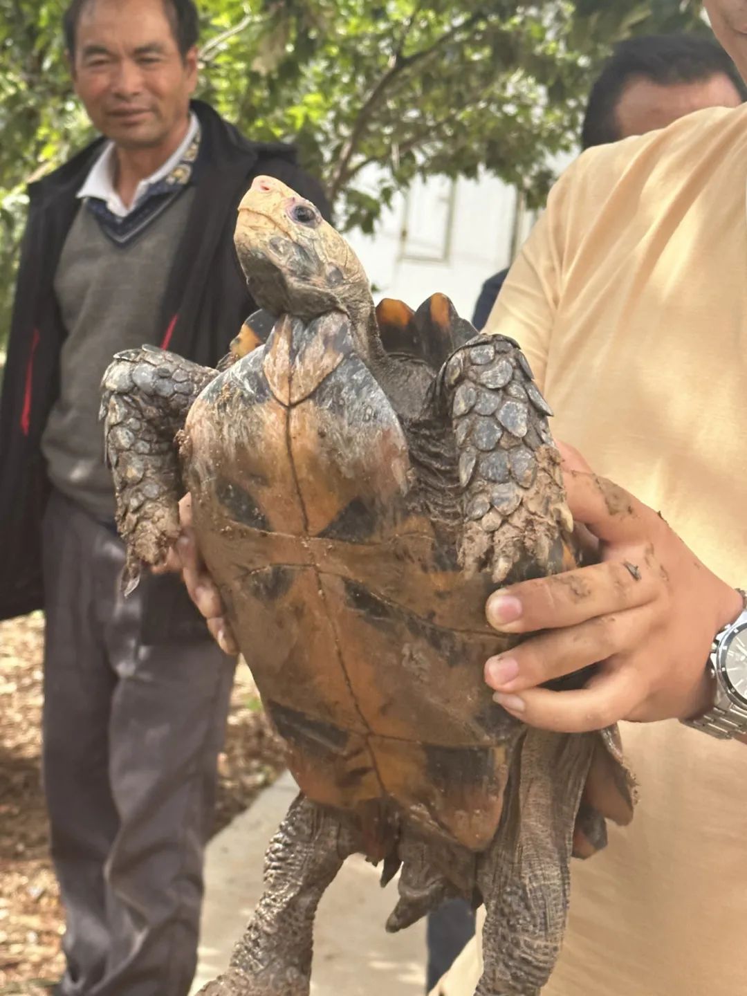 “刚刚下过一场大雨,我回家后,突然发现院子里有一只长的很怪异的乌龟,就让女儿在网上查了相关信息,并联系有关部门来鉴定收容。”村民张正能激动地告诉记者。