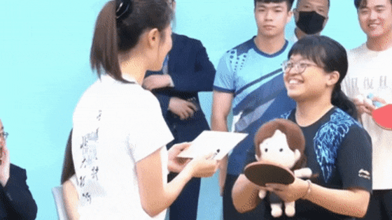 在台湾政治大学体育馆,大陆学生团团长、奥运冠军丁宁与该校乒乓球队队员切磋球技。一位岛内球迷拿出观看丁宁比赛时买的球拍,要请偶像签名。她激动地说,自己喜欢丁宁十多年了,丁宁身上不放弃的精神一直感染着她。当两人最后热情相拥时,赢得在场所有人的热烈掌声。