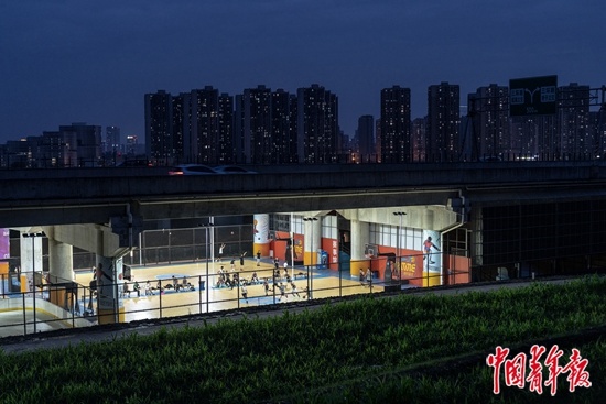 6月28日,成都锦江区,随着夜色降临,三环路下的运动场亮起了灯。
