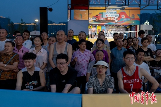 6月26日,成都凤凰山体育公园,观看三对三篮球赛的观众们。