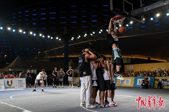 6月26日,成都凤凰山体育公园,篮球比赛间隙的扣篮表演。
