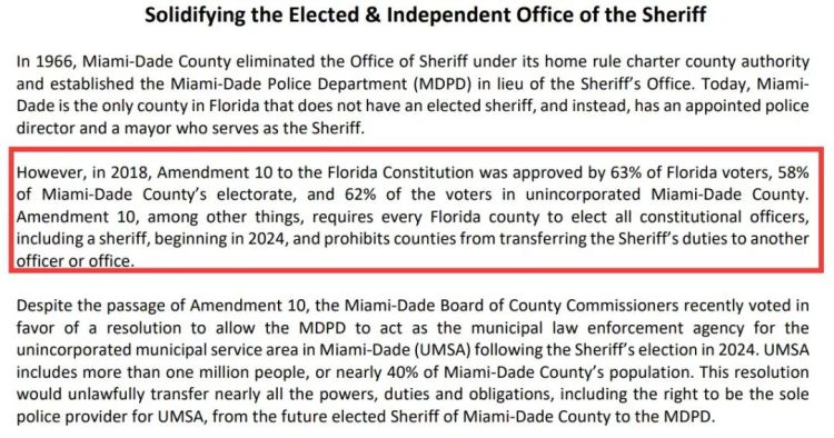 另外,今年5月,他还曾宣布将参加明年的县警察局局长的选举。公开资料显示,迈阿密-戴德县是佛罗里达州唯一一个由当地政府行政指派警察局长的地方,该州其他县的警察局长都是投票选举出来的。但佛罗里达州在2018年通过了法律修正案,要求该州所有县都必须从2024年起选举警察局长,不能再行政指派,所以拉米雷兹如果想继续担任迈阿密-戴德县的警察局长,就也要去竞选了。