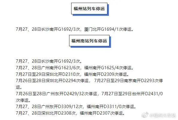 因台风影响,该站7月27日至7月28日以下列车临时停运: