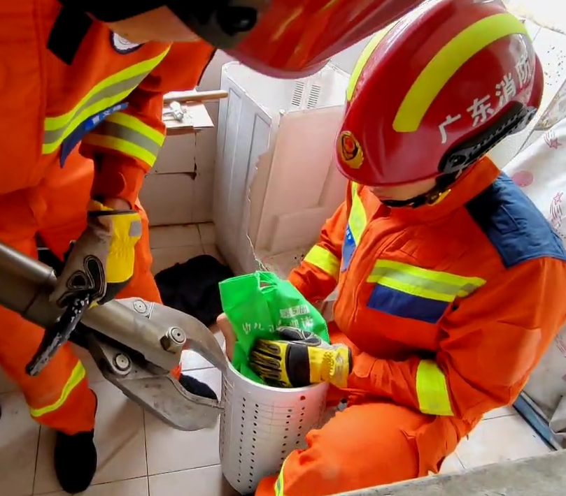 了解现场情况后,消防员立刻展开救援。考虑到洗衣机干衣桶的空间太小,硬把小男孩拉出有可能会对其造成二次伤害,于是消防员立即对小男孩做好防护,一边对小男孩进行情绪安抚,一边把干衣桶从洗衣机中拆出来,再使用破拆工具剪开干衣桶。