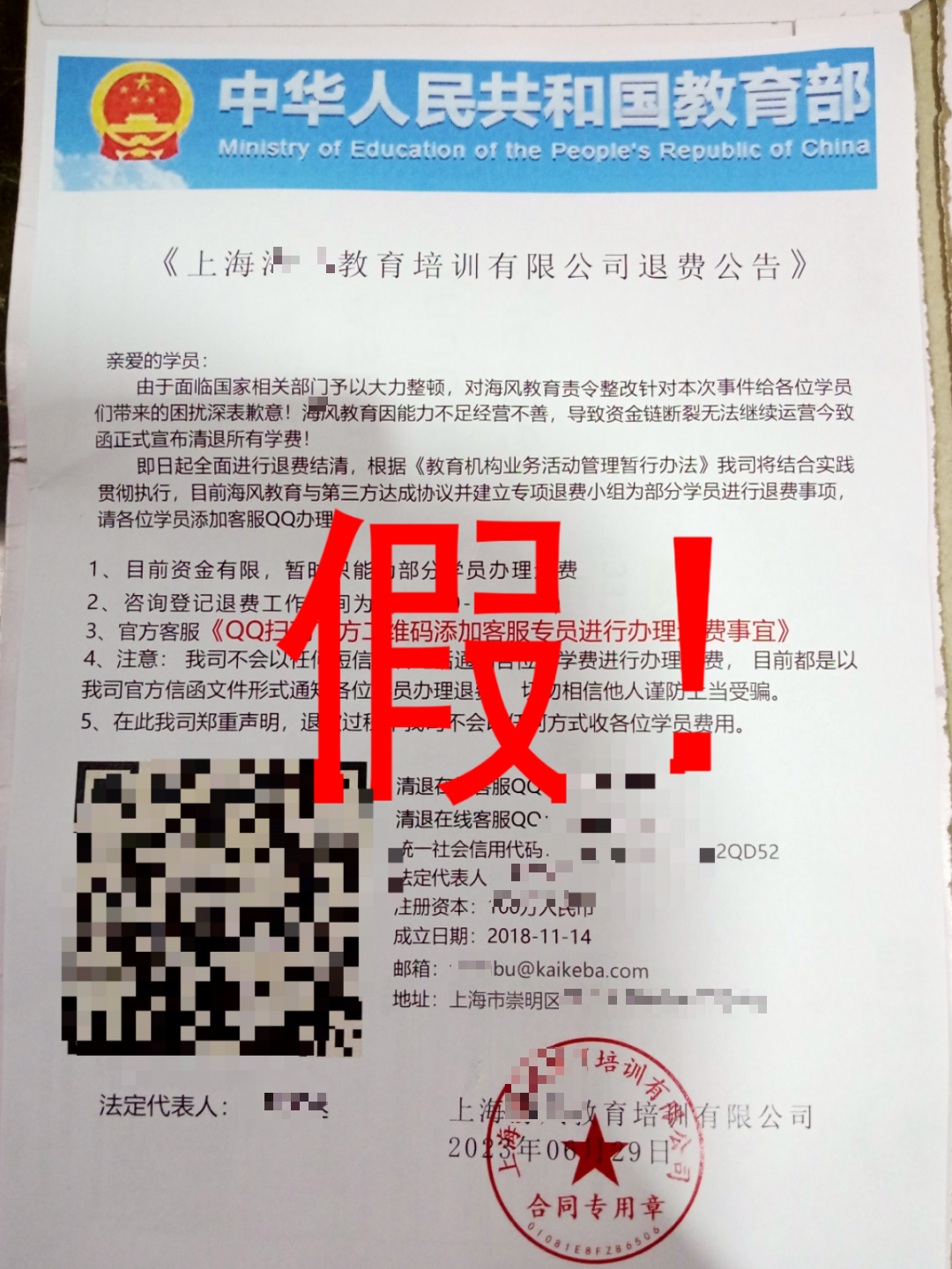 近日,南太湖新区康山街道的蔡某、吴某都收到了一份陌生快递,拆开后发现里面有一张“教育部”抬头的某培训机构退费公告,公告中表示该机构因经营不善资金链断裂,现按照相关规定,给部分学员办理退费,并附上QQ号和二维码。