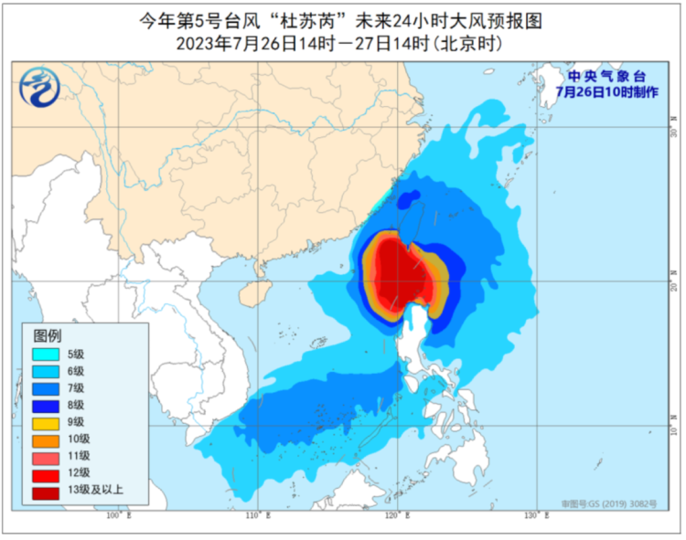 中央气象台预计,26日14时至27日14时,巴士海峡、台湾以东洋面、南海东北部和南部海域、台湾海峡、东海南部,以及台湾岛及其沿海、福建沿海将有6至8级大风、阵风9至10级, 其中巴士海峡、南海东北部偏东海域、台湾海峡偏南海域、台湾岛南部沿海风力可达9至12级、阵风13至15级,“杜苏芮”中心经过的附近海域风力可达13至17级,阵风17级以上。