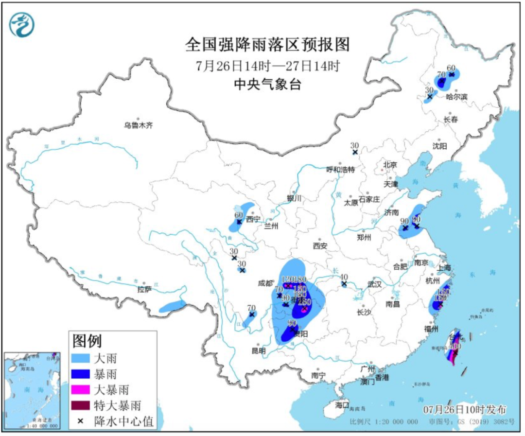 中央气象台26日10时继续发布暴雨蓝色预警 。预计,26日14时至27日14时,黑龙江西南部、吉林西部、青海东部、四川盆地、重庆西部和南部、贵州中西部、山东南部、江苏北部、浙江东部、台湾岛等地部分地区有大到暴雨,其中,四川盆地东部、重庆西部、贵州北部、浙江东南部沿海等地部分地区有大暴雨,台湾岛东部和南部部分地区有大暴雨到特大暴雨(250~400毫米); 上述部分地区伴有短时强降水,局地有雷暴大风等强对流天气。