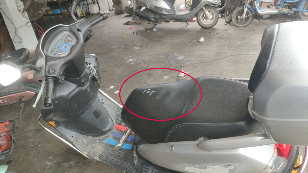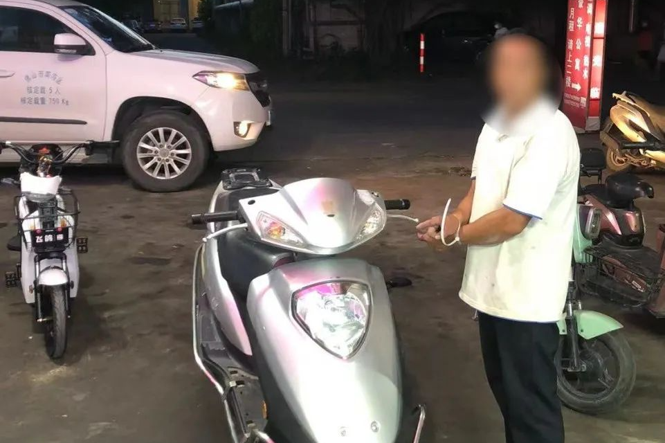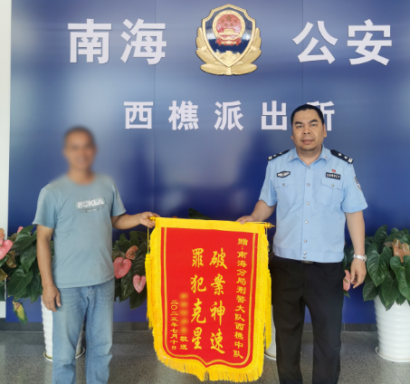 ▲事后,摩托车车主将一面印有“破案神速 罪犯克星”的锦旗送至派出所