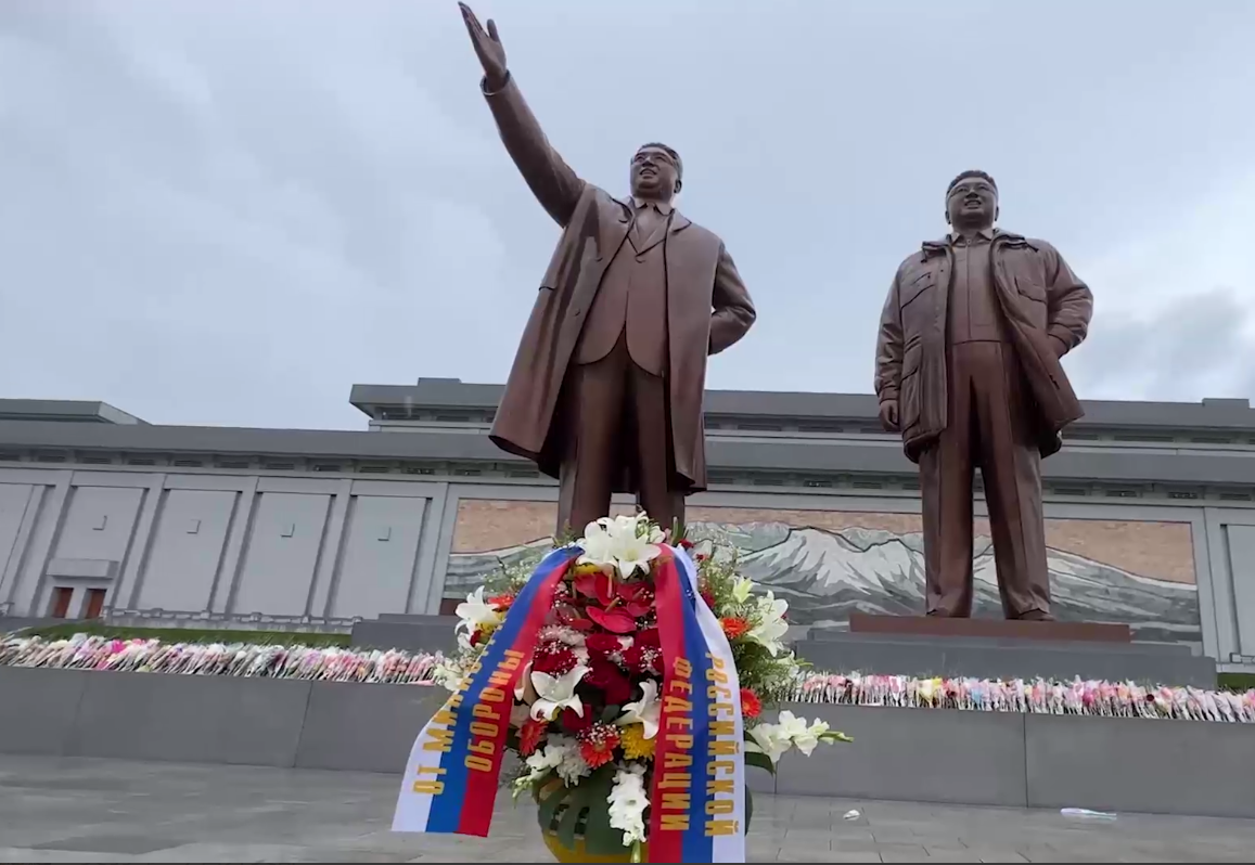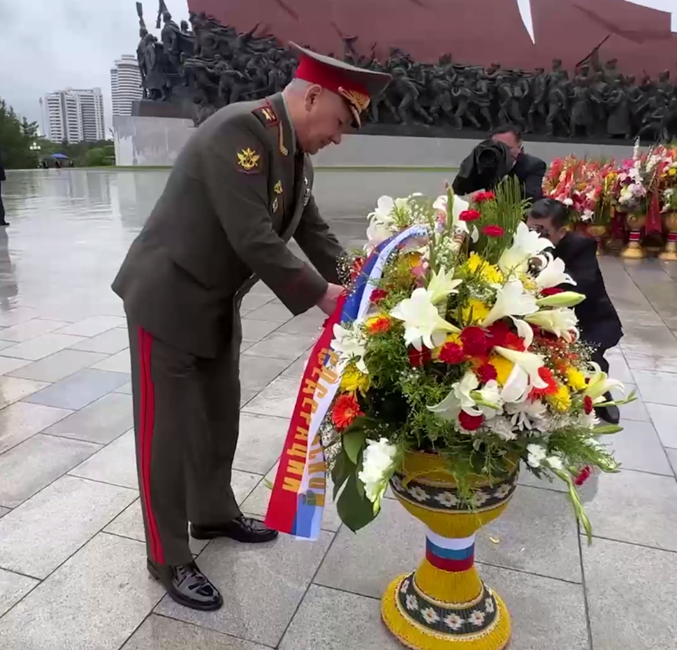 据塔斯社报道,俄国防部当天在Telegram上说,在参加上述活动前,绍伊古还向位于平壤万寿台山岗的朝鲜已故领导人金日成和金正日铜像献花。
