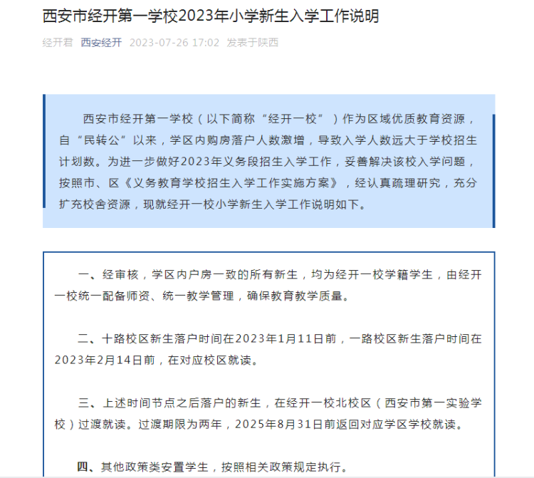 三、上述时间节点之后落户的新生,在经开一校北校区(西安市第一实验学校)过渡就读。过渡期限为两年,2025年8月31日前返回对应学区学校就读。