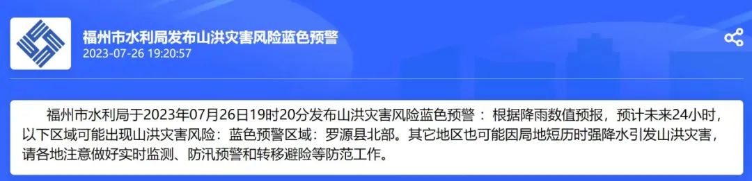 水利局发布山洪灾害风险蓝色预警