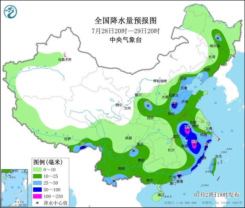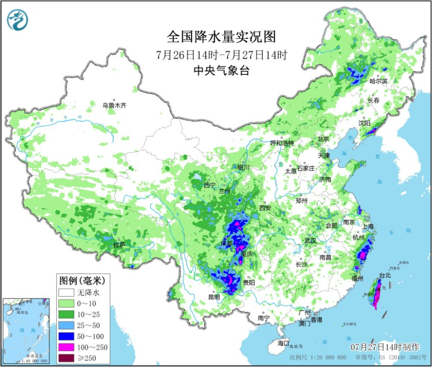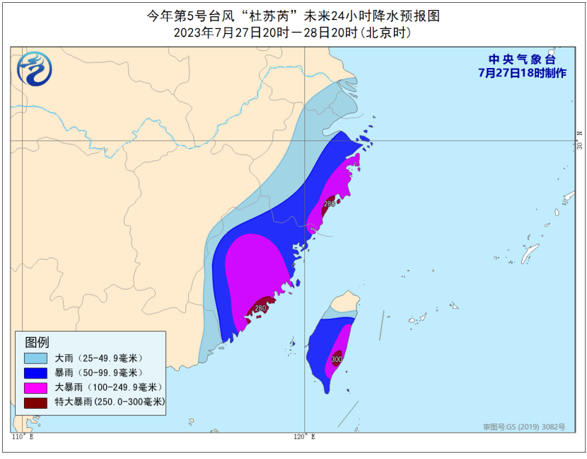 27日至28日,台湾岛、福建、广东东部、浙江东部和南部、江西东部等地有暴雨或大暴雨,台湾岛东部等地有特大暴雨。