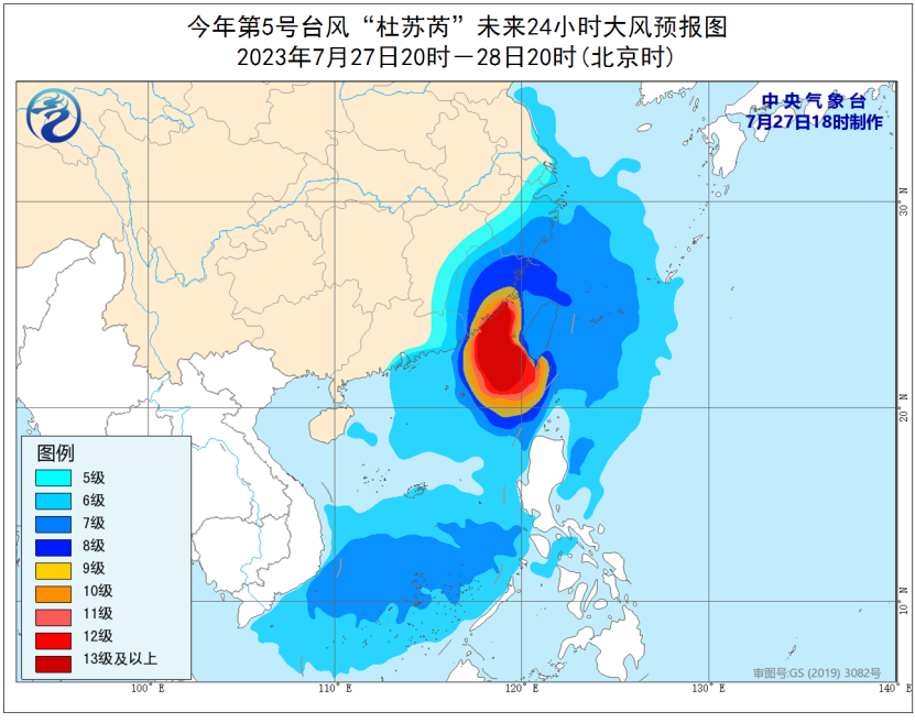 7月27日17时,“杜苏芮”的中心距离福建省厦门市南偏东方向约360公里,中心附近最大风力16级(52米/秒,超强台风级)。预计“杜苏芮”28日早晨到上午在福建东山到莆田一带沿海登陆,登陆时强度为强台风级或超强台风级(48米至55米/秒,15至16级)。