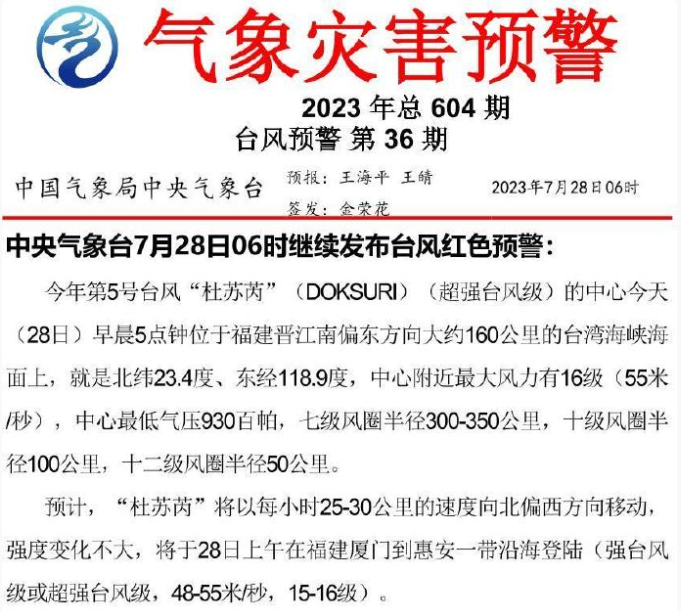 今年第5号台风“杜苏芮”(DOKSURI)(超强台风级)的中心今天(28日)早晨5点钟位于福建晋江南偏东方向大约160公里的台湾海峡海面上,就是北纬23.4度、东经118.9度,中心附近最大风力有16级(55米/秒),中心最低气压930百帕,七级风圈半径300-350公里,十级风圈半径100公里,十二级风圈半径50公里。