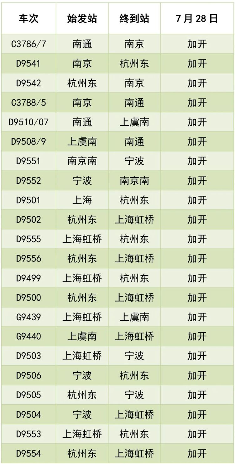 停运、增开列车车次及时间等相关信息,请以车站公告为准,若有疑问可致电铁路客服热线021-12306咨询。旅客还可关注铁路12306客服网站公告,以及长三角铁路官方微博、微信信息,以便合理安排行程。