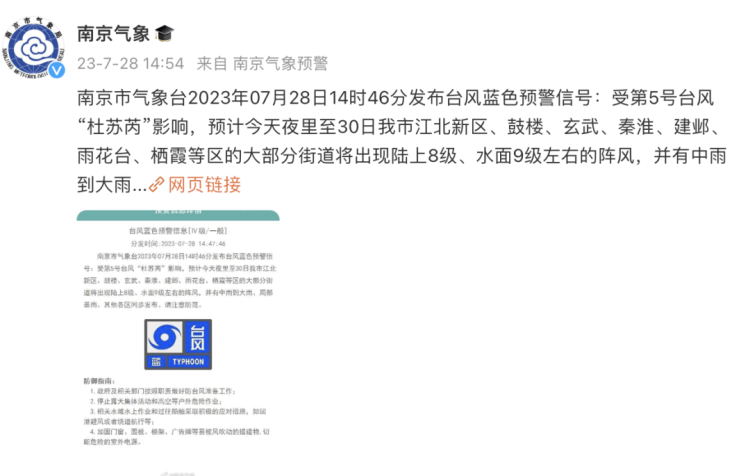 省防指今日13时启动我省防台风IV级应急响应。市气象台今日14时50分发布台风蓝色预警信号。根据《南京市防台风应急预案》,市防办决定,7月28日15时起,启动全市防台风IV级应急响应(蓝色) 。请各区各单位按照响应要求,密切关注台风动向及水雨情变化,加强巡查值守,做好工程调度,落实抢险准备,全力做好防台风各项工作,确保人民群众生命财产安全。
