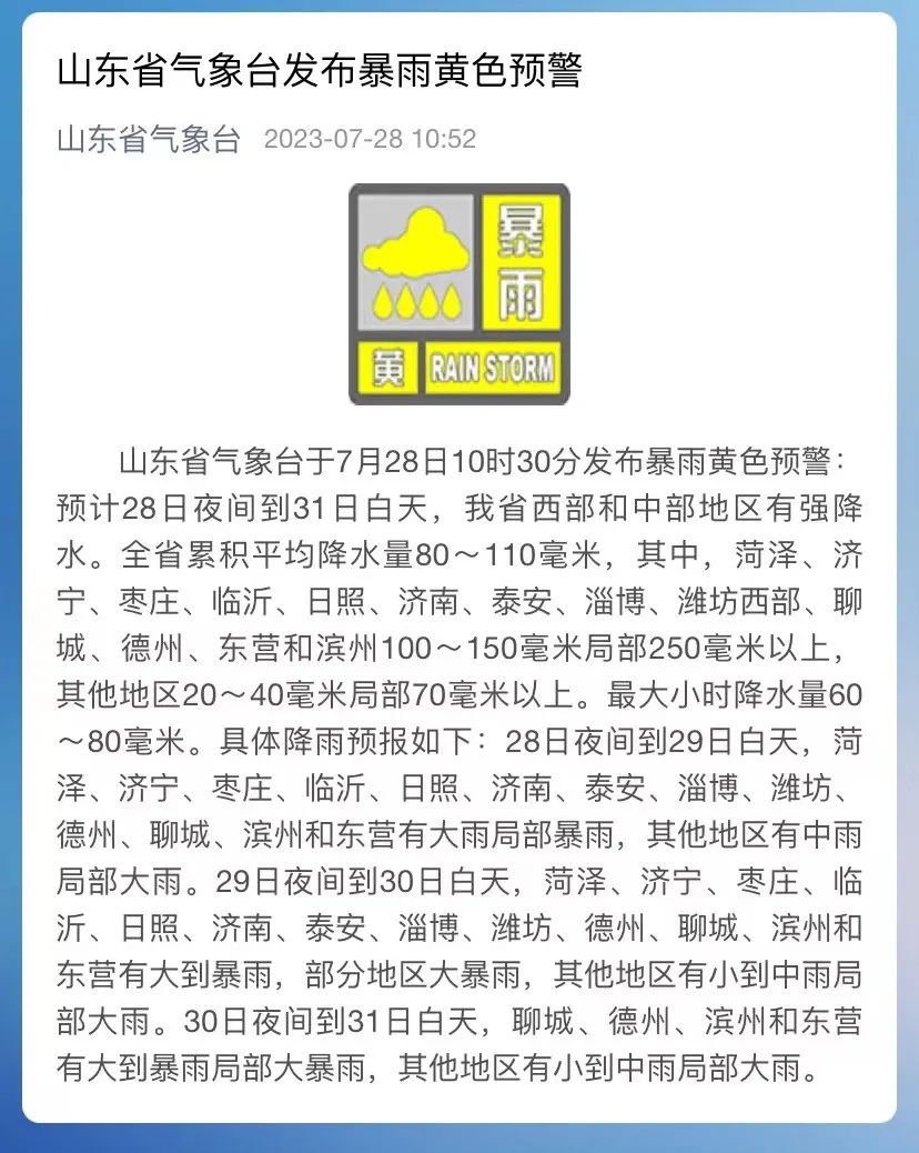 山东省气象台于7月28日10时30分发布第5号台风“杜苏芮”预报和暴雨黄色预警:
