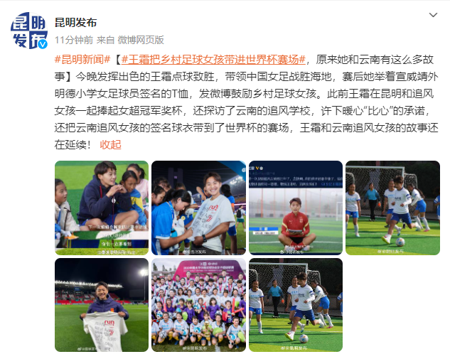【#王霜把乡村足球女孩带进世界杯赛场#,原来她和云南有这么多故事】今晚发挥出色的王霜点球致胜,带领中国女足战胜海地,赛后她举着宣威靖外明德小学女足球员签名的T恤,发微博鼓励乡村足球女孩。此前王霜在昆明和追风女孩一起捧起女超冠军奖杯,还探访了云南的追风学校,许下暖心“比心”的承诺,还把云南追风女孩的签名球衣带到了世界杯的赛场,王霜和云南追风女孩的故事还在延续!