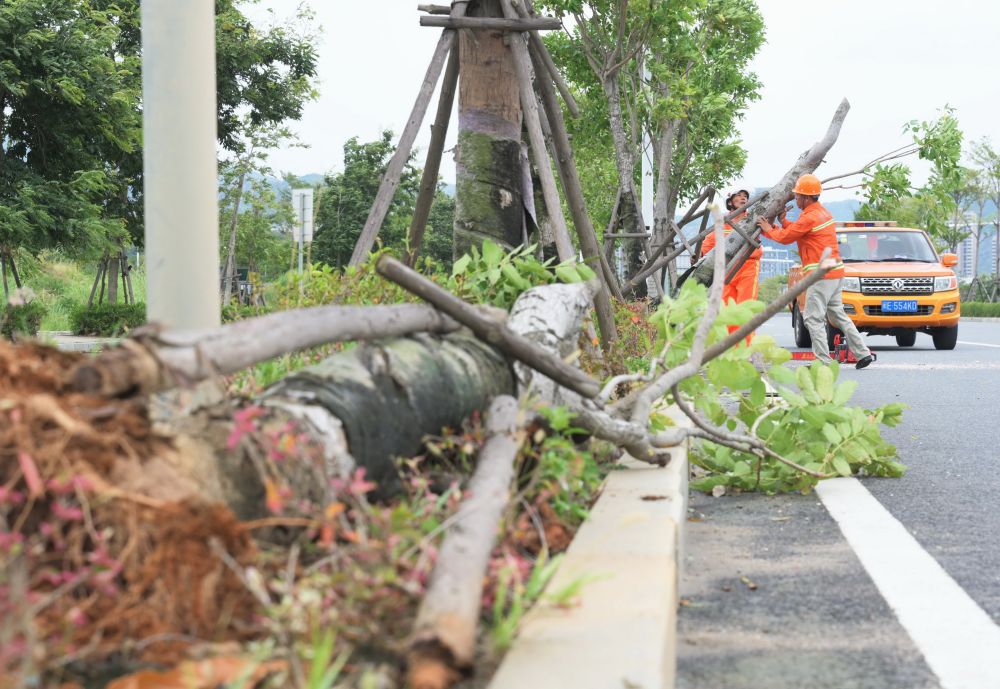 “虽然树倒了,但是根没有完全断,扶正之后还能存活。”白坑公路站站长杨龙忠与同事一边趴下检查行道树的受损情况,一边合力将倒伏在路面的树木扶正加固。对于一些根系受损严重的树木,杨龙忠在检查后招呼同事过来,用油锯切断末端的枝叶。