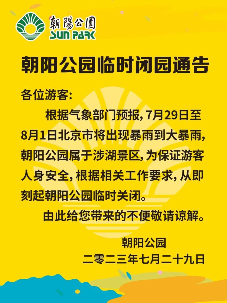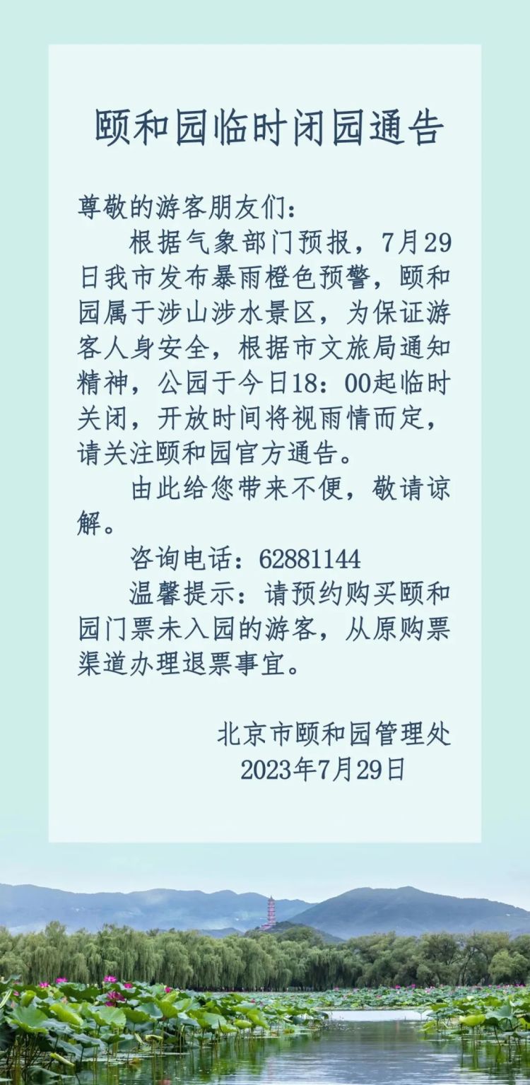 根据气象部门预报,7月29日我市发布暴雨橙色预警,景山公园属于涉山涉水景区,为保证游客人身安全,根据北京市文化和旅游局通知,公园自7月29日18时起临时关闭,开放时间将视雨情而定。