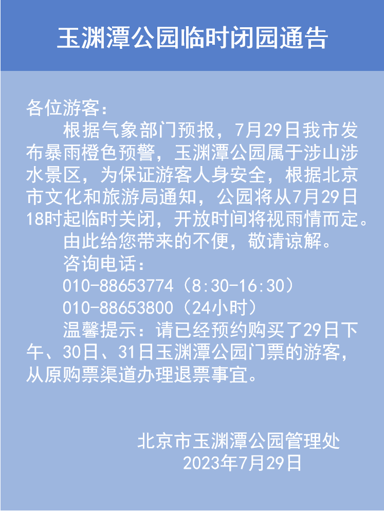 根据气象部门预报,7月29日我市发布暴雨橙色预警,紫竹院公园属于涉山涉水景区,为保证游客人身安全,根据北京市文化和旅游局通知,公园自7月29日18时起临时关闭,开放时间将视雨情而定。