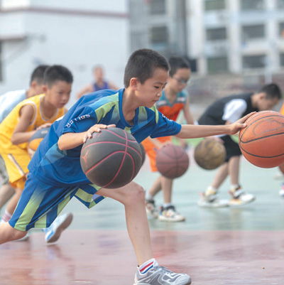 湖南永州市道县树湘学校学生参加暑期篮球训练。
