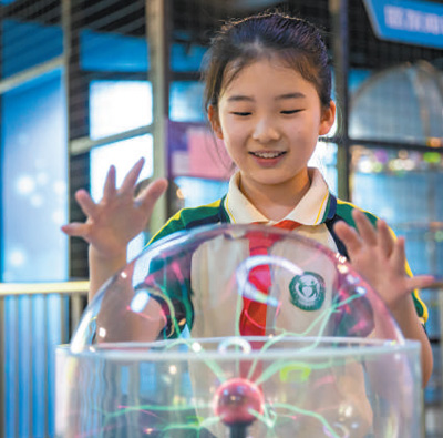 暑假期间,江苏海安市教师发展中心附属小学学生在科普馆体验科技装置。