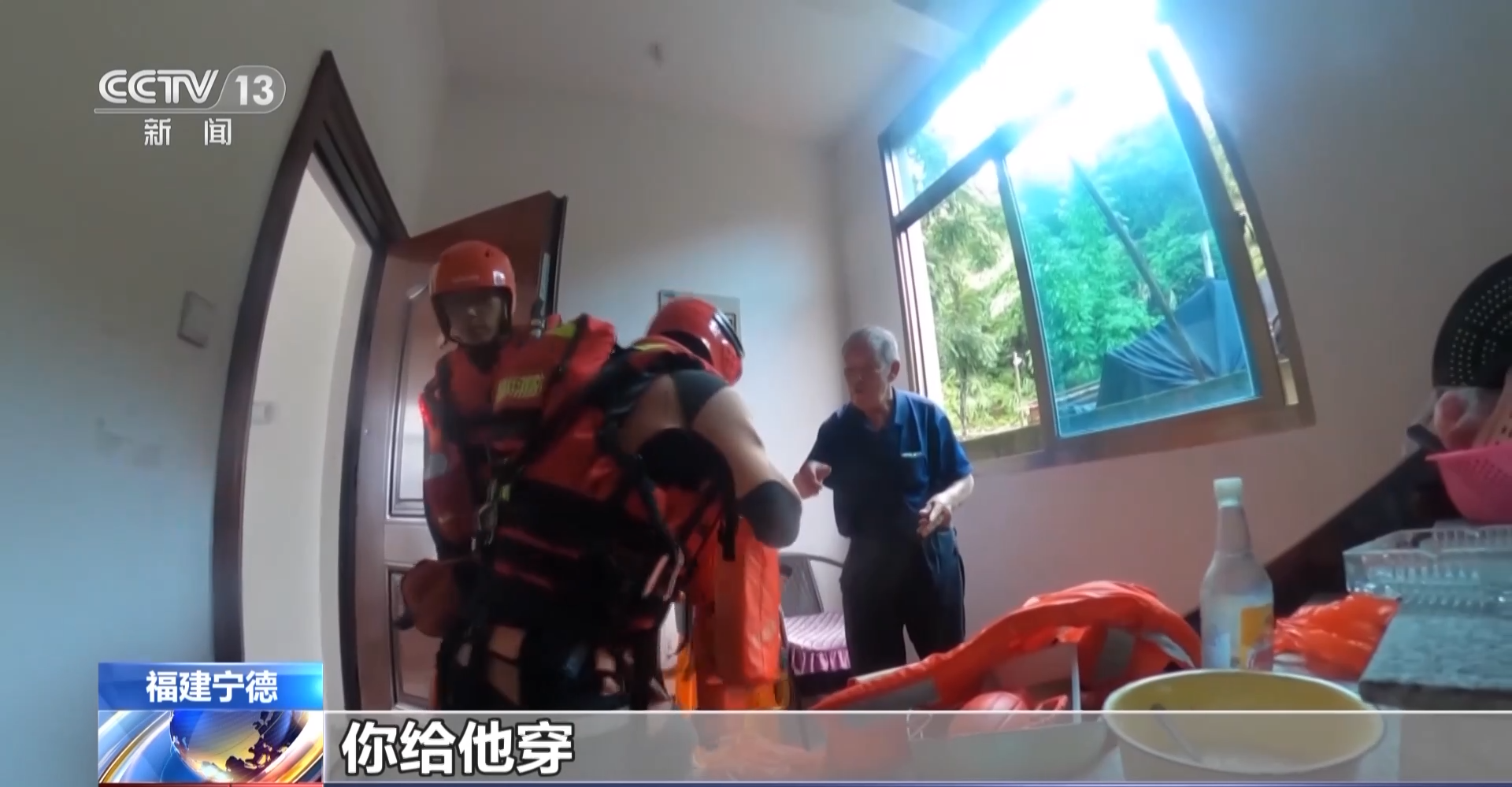 消防救援人员:爷爷,你先把这个穿上。你扶着我,抓住我,抓紧我。